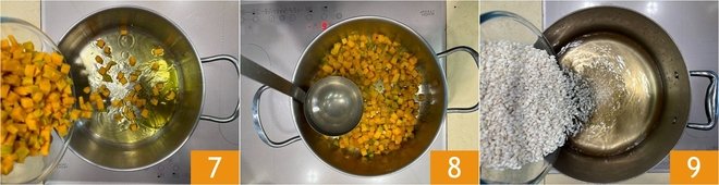 In another pot, heat another drizzle of oil, add the pumpkin cubes 7 and briefly sauté them, then salt, pepper, and cook for 15 minutes, adding about 1 cup (8 oz) of vegetable broth 8. Meanwhile, boil the rice in 3 cups (24 oz) of vegetable broth for 12 minutes 9.