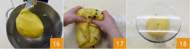 The dough will now be wrapped around the hook and the raisins well mixed with the other ingredients 16: transfer the dough to a lightly oiled work surface (if you prefer, you can oil your hands to facilitate working with the dough) and fold it to strengthen it by bringing the edges inward 17. After working it, form it into a ball and place it in a bowl that you will place in a turned-off oven with the light on to rise for 2 hours and 30 minutes or until it has doubled in volume 18.