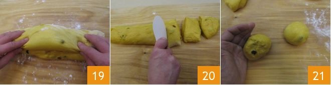 After the necessary time, transfer it to a lightly floured work surface and shape it into a loaf 19. Divide the loaf into 8 pieces, each approximately 4.6 oz 20, and form each into small balls of dough 21.