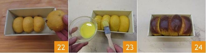 Place 4 of them side by side in a greased and floured loaf pan measuring 8x4.3 inches and repeat the operation for the second pan 22 (alternatively, you can use a single pan that measures twice the indicated size; if you don’t have two pans of the same size, you can make a classic loaf brioche and let the remaining dough rise by forming rolls, as noted in the box below). Let it rise in a turned-off oven with the light on for another hour or until it has doubled in volume. After the final rise, brush the pumpkin brioche bread with the beaten yolk with cream 23 and bake in a preheated static oven at 356°F for 30 minutes (if you don’t have a static oven but a convection one, you can bake at 320°F for 20 minutes), always remembering to do the toothpick test to check if it’s done. Once the baking time is up, remove the pan from the oven 24, let it rest for 10 minutes before enjoying this soft pumpkin brioche bread!