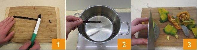 To prepare the pumpkin brioche bread, start by cutting a vanilla bean and removing the seeds 1 that you will set aside to flavor the dough: place the pod in a steamer pot filled with water 2. Turn on the heat to warm the water. While the water is getting aromatic, proceed with cleaning the pumpkin: remove the outer peel 3, seeds, and fibers with a spoon, then cut it into thin slices.