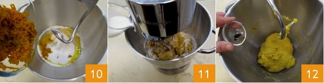 Also add the cooked pumpkin pulp while it is still warm 10 and, while mixing on low speed, slowly pour in the milk at room temperature 11. Continue working the dough and when it becomes fairly homogeneous, add the vanilla bean seeds 12. Let the mixer run for another 10 minutes.