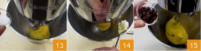 Finally, add the salt 13 and let the mixer, set to medium speed, incorporate the ingredient into the dough. Then, add the butter, slightly softened at room temperature, a little at a time 14. Add a piece each time the previous one has been fully absorbed into the dough. When the dough is well wrapped around the hook, add the raisins (no need to soak them beforehand) 15: let them incorporate by letting the mixer run for another 3-4 minutes.