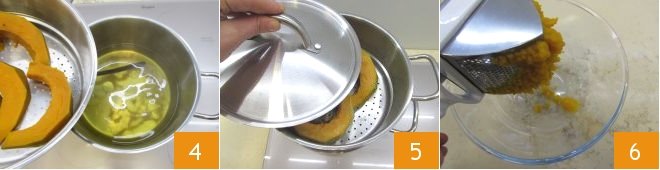 Place the steamer in which the sliced pumpkin is arranged into the pot 4. Cover with a lid 5 and let the pumpkin steam for about 30 minutes or until it becomes soft. To check if it’s done, you can do the toothpick test. Once softened, mash the pumpkin with a potato masher in a large bowl 6 and keep it warm. If you have already cooked pumpkin, you can use 12.7 oz for this recipe.