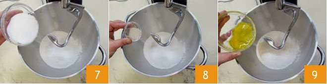 At this point, prepare the dough: in a stand mixer fitted with a dough hook, add the two sifted flours, the sugar 7, the yeast 8, and the beaten egg 9.