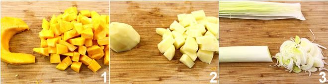 To prepare the pumpkin cappuccino, start by removing the skin and seeds from the pumpkin with the help of a spoon and cutting the flesh into cubes 1. Peel the potatoes and cut them into cubes as well 2. Clean the leek and chop it very finely 3.