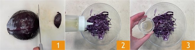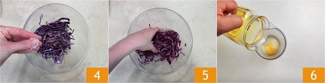 To prepare the pumpkin cutlet burger, start by cleaning the cabbage: remove the outer leaves, then thinly slice it into strips 1. Transfer the cabbage to a bowl and dress with oil 2 and vinegar 3.