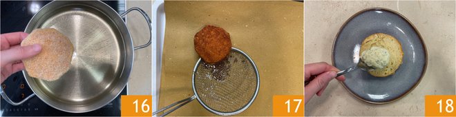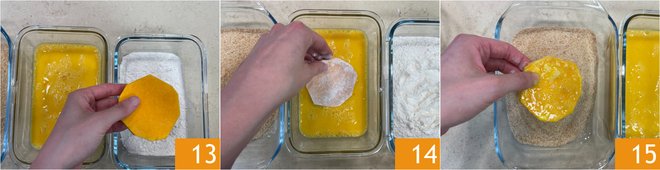 Dip the pumpkin slices first in flour 13, then in beaten eggs 14 and finally in breadcrumbs 15.