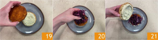 Place the cutlet on top 19, then add a handful of marinated and well-squeezed cabbage 20. Close with the other half of the bun on which you have spread a little more mayonnaise and your pumpkin cutlet sandwich is ready 21!