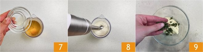 Add a pinch of salt 4, mix and set aside 5. Move on to the Mayonnaise with Immersion Blender: pour the egg and oil into a jug 6.