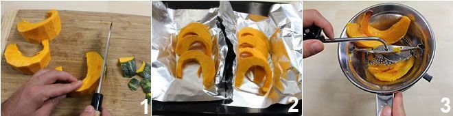 To prepare the pumpkin gnocchi alla romana, first cut the pumpkin, remove the seeds and skin 1 and place it on a baking tray wrapped in aluminum foil 2. Cook at 390°F for 40 minutes. Once ready, let it cool and then pass it through a food mill 3 to obtain a puree that you will set aside.