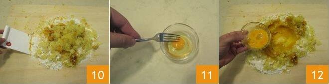Work the dough as quickly as possible, using a dough scraper to compact the ingredients 10. Then beat an egg 11 and, after shaping the dough into a well, add the egg to the center 12.