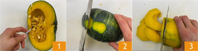 To prepare pumpkin in saor, first, make the Vegetable broth using our recipe, and keep it warm. Cut the pumpkin in half, remove the seeds and inner filaments 1, then peel the skin 2 and slice the flesh 3.