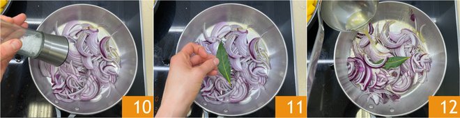 Add salt 10, bay leaf 11, and a ladle of vegetable broth 12. Let simmer over medium-low heat for about 15 minutes.