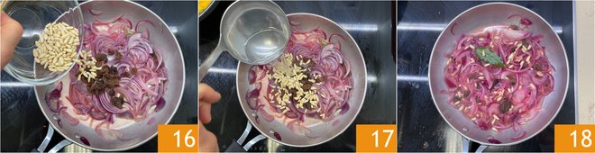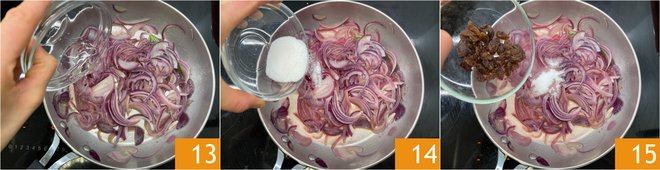 At this point, add the vinegar 13, sugar 14, and raisins 15.