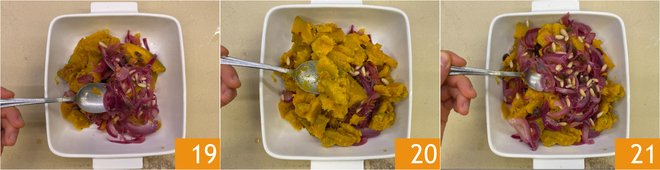 Now transfer both the pumpkin and the onion into a baking dish, alternating the layers 19 20 21. Place in the refrigerator and let rest for 6 to 12 hours to allow the flavors to blend well.