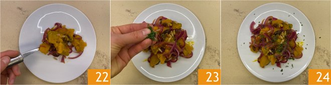 After the resting time, plate 22 and finish with chopped parsley 23. Your pumpkin in saor is ready to be enjoyed 24!