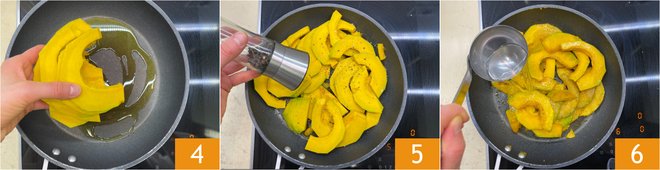 Heat a little oil in a pan, then add the pumpkin 4 and season with salt and pepper 5. Cook over medium heat for 2 minutes, then pour in a ladle of vegetable broth 6.
