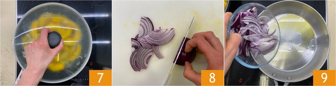 Cover with a lid 7 and continue cooking over medium-low heat for about 10 minutes. Meanwhile, clean and thinly slice the onion 8. In another pan, pour a little oil along with the onions 9.