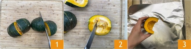 To prepare the pumpkin pasta with scallion oil, take the pumpkin, divide it into four parts 1, keep the skin, but remove the seeds and internal filaments 2. Wrap the wedges in oven-safe aluminum foil 3.
