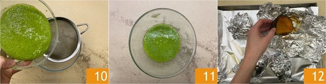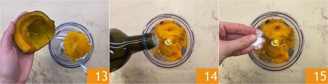Strain the obtained puree through a fine mesh strainer 10, thus getting a flavored oil 11. Once the pumpkin is ready, take it out of the oven 12.