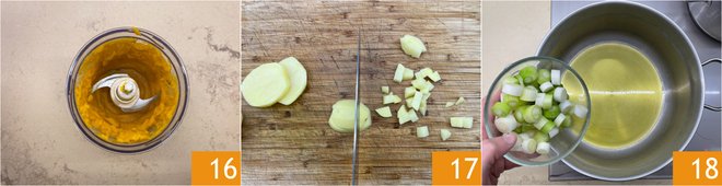 Blend until the cream is smooth and set aside 16. Peel and dice the potatoes 17. In a tall pot, pour a splash of olive oil and the white part of the scallion 18.