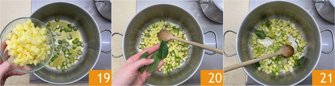Add the potatoes 19 and season with bay leaf 20. Salt and pepper, then sauté over moderate heat 21.