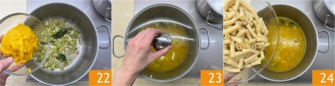 Add the pumpkin cream 22, mix well, and pour in 2 ladles of vegetable broth or hot water, cover with the lid, and cook for 10 minutes 23. At this point, add the pasta to the pot 24.