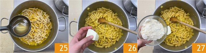 Cook by adding enough vegetable broth or hot water to cook the pasta 25, remove the bay leaf, and stir occasionally. Blend with butter 26 and grated Grana Padano DOP 27.