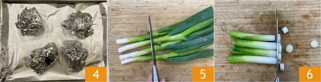 Cover a baking tray with more foil, place the pumpkin on it, and bake in a preheated oven at 350°F for 90 minutes 4, this way the pumpkin will remain moist. Meanwhile, prepare the scallion oil: separate the green tops 5 and slice the white part 6.