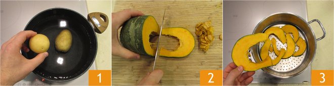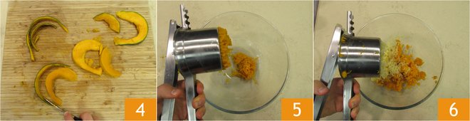 Remove the skin from the pumpkin 4 and mash it with a potato masher 5, retrieve the potatoes and mash them in the same way 6. Let them cool slightly.