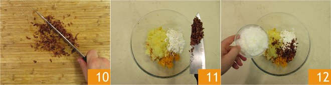 Chop the speck with a knife 10. At this point, still using the potato masher, refine the ricotta in the bowl with pumpkin and potatoes, add the speck crumbs 11 and grated pecorino cheese 12.