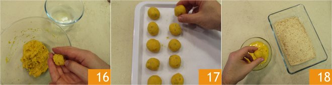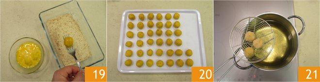 Moisten your hands and form small bites of about 0.5 oz (15 grams) each 16, this will yield around forty pieces. As you go along, place them on a tray lined with parchment paper and leave to rest in the refrigerator for an hour 17. After the time has elapsed, heat the oil to 320-340°F (160-170°C) and pass the bites first in beaten eggs 18