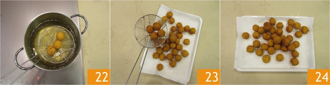 Drain 22 on absorbent paper 23 and continue with all the others. Your pumpkin, ricotta, and speck bites are ready 24 to be enjoyed hot, accompanied by Greek yogurt flavored with grated lime zest.