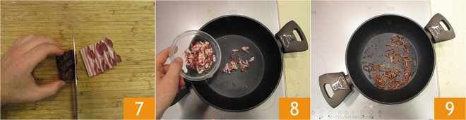 In the meantime, remove the rind from the speck if there is any, slice thinly to a couple of mm thick 7, then cut into strips. Sauté them over high heat in a non-stick pan 8 until golden 9.