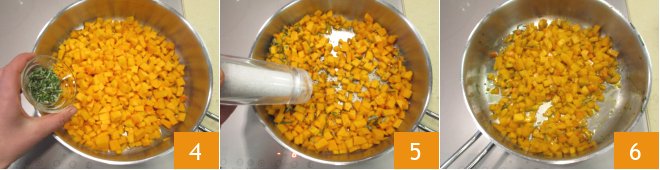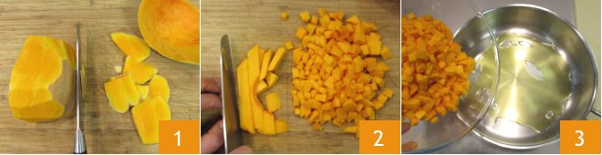 To prepare the pumpkin savory pie, first remove the pumpkin skin with a knife 1, then cut the flesh into cubes of about 0.75 inches 2: you will need about 1 lb of cleaned pumpkin in total. Heat the oil in a pan and add the cubed pumpkin 3.