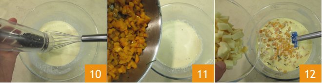 Salt and pepper 9, then add the lukewarm pumpkin 11 and scamorza cheese 12 and mix well to combine everything.