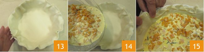 Unroll the puff pastry and place it in a baking dish with a diameter of 8.75 inches at the base and 10.25 inches on the surface 13. Pour the mixture inside 14 and fold the edge of the puff pastry to create a decorative pattern 15.