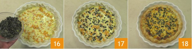 Finally, distribute the pumpkin seeds on the surface 16, then bake in a preheated static oven at 350°F for about 60 minutes, placing it on the bottom shelf 17. Once cooked, let your pumpkin savory pie rest for 10-15 minutes before serving 18!