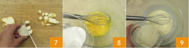 Meanwhile, cut the scamorza cheese into cubes 7. Now beat the eggs in a bowl, add the cream 8, and grated Grana Padano 9.