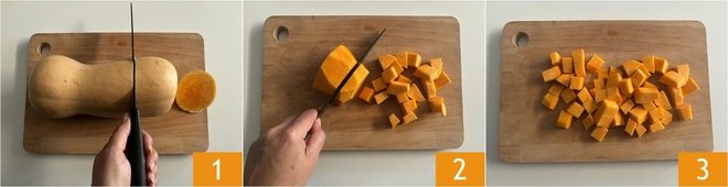 To prepare the pumpkin spice latte, start with the pumpkin cream: clean the pumpkin 1 by removing the skin, seeds, and fibers, then cut 5.6 oz (160 gr) of pulp into cubes 3.