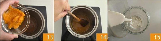 Add the pumpkin cream 13 and bring to a boil, then simmer on low heat for about 2 or 3 minutes, continuing to stir. Set the syrup aside and let it cool 14. Move on to the whipped cream: pour the cold cream into a bowl 15 and add the powdered sugar.