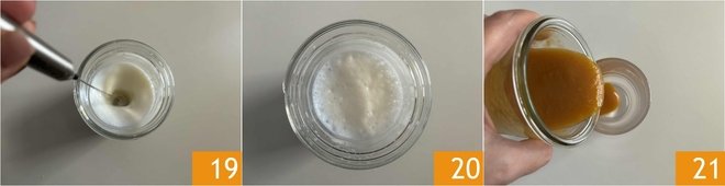 Then take a frother 19 to create the foam 20. Finally, prepare the coffee. You are ready to assemble the cups: pour the pumpkin syrup at the bottom 21.