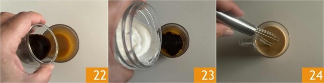 Add a shot of coffee 22, then pour the frothed milk 23 and stir 24.