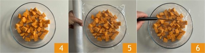 Place the pumpkin cubes in a large baking dish 4, cover with plastic wrap 5, pierce the surface, and cook in the microwave on high power for 6 minutes 6. If you don't have a microwave, you can steam the pumpkin: it will take about 10 to 12 minutes.