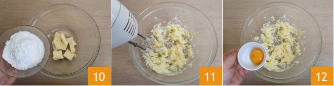 In another bowl, add the softened butter along with the powdered sugar 10 and beat with an electric mixer 10. Add 1 yolk at a time 12