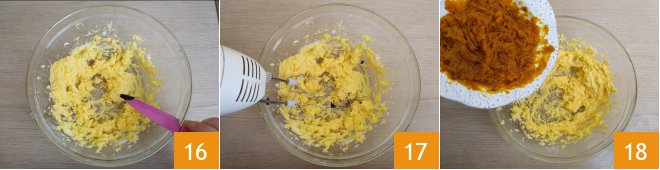 and add them to the mixture 16. Mix with the mixer 17 and add the pumpkin pulp 18.