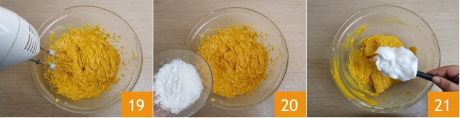 Blend with the mixer 19. Then add the cornstarch 20 and mix with a spatula. Finally, gently incorporate the stiff egg whites little by little 21,
