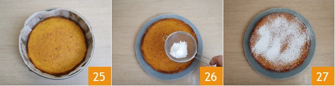 and bake in a preheated static oven at 340°F for 35 minutes. Do the toothpick test before removing the cake from the oven 25. Once ready and cooled, remove it from the mold and dust it with powdered sugar 26 before serving 27.
