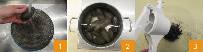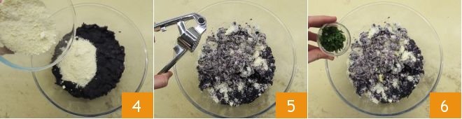 To prepare the purple potato culurgiones with artichokes, first take care of the filling: wash the purple potatoes 1 and then boil them in water 2 for about 30 minutes from boiling; check the cooking by piercing them with the prongs of a fork. Mash them while still hot with a potato masher into a bowl 3,